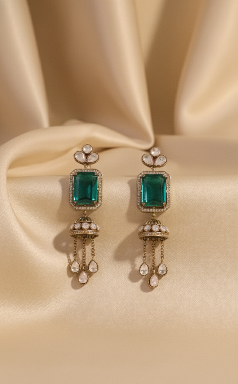 • Earring Style: Emerald stud with jhumki drop and polki embellishments