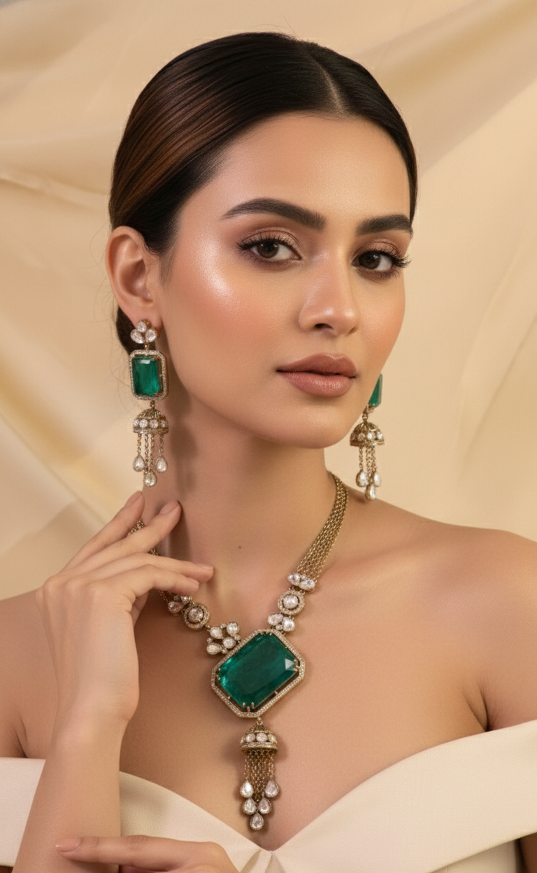 This captivating piece features a bold emerald-green center stone framed with uncut polki-style detailing, delicate floral motifs, and a signature jhumki-inspired dangler. The layered chain adds richness and structure, making the necklace a true showstopper. The matching earrings mirror the same regal emerald stone, finished with elegant drops that move beautifully with every step.